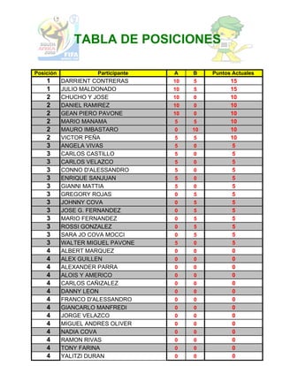 La tabla muestra la posición y puntos de varios participantes de un torneo. Los primeros lugares son compartidos por Darrient Contreras y Julio Maldonado con 15 puntos cada uno. El segundo lugar es compartido por 6 participantes con 10 puntos cada uno. El tercer lugar es compartido por 15 participantes con 5 puntos cada uno. Finalmente, el cuarto lugar es compartido por 14 participantes sin puntos.