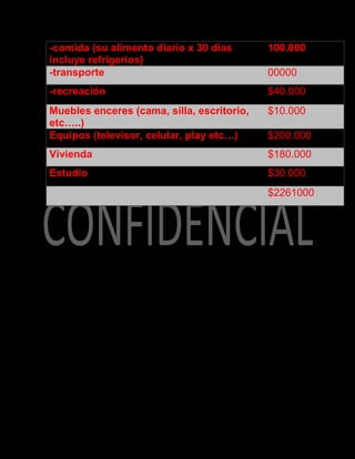 El documento detalla los gastos estimados de una persona por $560.000 pesos durante 30 días, incluyendo $100.000 en comida diaria y refrigerios, $40.000 en recreación, $10.000 en muebles, $200.000 en equipos electrónicos, $180.000 en vivienda y $30.000 en estudio.
