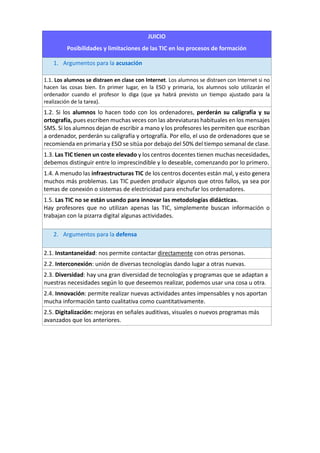 El documento presenta argumentos a favor y en contra del uso de las TIC en la educación. A favor se encuentra la instantaneidad, interconexión y diversidad que permiten las TIC, así como su potencial para la innovación y digitalización. Por el contrario, los argumentos en contra son que los estudiantes se distraen fácilmente en clase, pueden perder su caligrafía y ortografía al escribir menos a mano, que las TIC tienen un alto costo para los centros educativos y a menudo presentan problemas con la infraestructura.