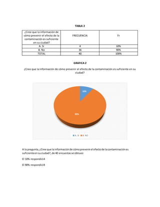 El documento presenta los resultados de una encuesta sobre la contaminación ambiental y la conciencia ecológica de las personas. Muestra que la mayoría de los encuestados consideran que la contaminación ambiental es un problema actual y que la información sobre cómo prevenir sus efectos es insuficiente. Además, la mayoría apoya las jornadas de limpieza en sus hogares y cree que dar buen manejo a los desechos contribuye a la preservación ambiental.