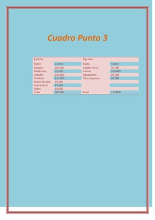 Este documento presenta un cuadro con los egresos e ingresos de un proyecto. Los egresos totales ascienden a $600.000, siendo los rubros más altos equipos, alquiler y servicios. Los ingresos totales son $210.000, donde la partida más alta corresponde a ventas. El cuadro muestra la situación financiera de un proyecto con mayores egresos que ingresos.