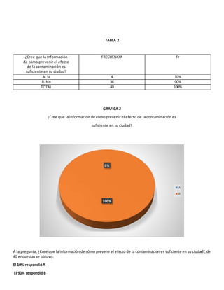 El documento presenta los resultados de una encuesta sobre temas ambientales realizada a 40 personas. Muestra 5 tablas y gráficas con preguntas como si la contaminación es un problema, si hay suficiente información para prevenirla, y si apoyan la limpieza. Los resultados mostraron que la mayoría considera que la contaminación es un problema actual, no hay suficiente información para prevenirla, y apoyan la limpieza en su hogar para preservar el medio ambiente.