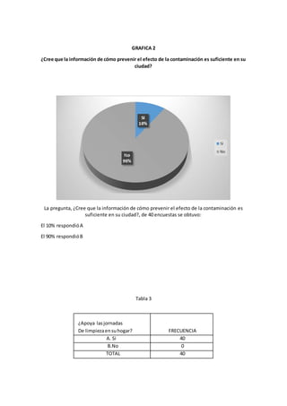 El documento presenta los resultados de 5 encuestas sobre temas relacionados con la contaminación ambiental y esfuerzos de preservación. La mayoría de los encuestados consideran que la contaminación es un problema social actual y apoyan las jornadas de limpieza, pero sienten que la información para prevenir la contaminación en su ciudad es insuficiente. Casi todos reconocen que dar buen manejo a los desechos en casa ayuda a preservar el medio ambiente.