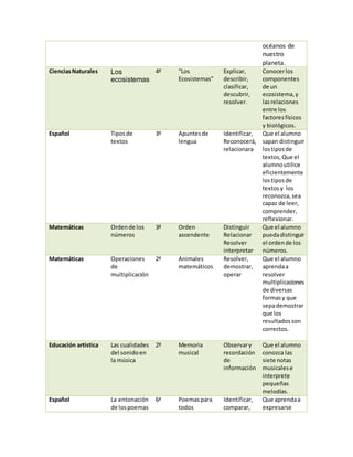 Este documento resume los objetivos de aprendizaje esperados para diferentes asignaturas y grados escolares. Los objetivos incluyen el reconocimiento de componentes de computadoras, partes del cuerpo humano, sujetos de oraciones y más. Los grados escolares van desde primero a sexto y las asignaturas cubren temas como matemáticas, historia, geografía, ciencias e inglés.