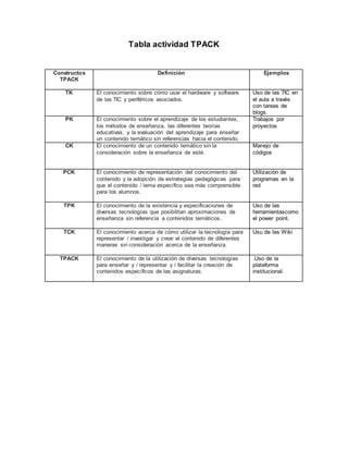 El documento describe los constructos del marco TPACK para la integración de tecnologías en la enseñanza. Define el conocimiento tecnológico (TK), pedagógico (PK), del contenido (CK) y sus intersecciones como conocimiento tecnológico pedagógico (TPK), tecnológico del contenido (TCK) y tecnológico pedagógico del contenido (TPACK), dando ejemplos de cada uno.
