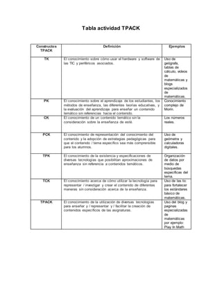 El documento presenta una tabla que define los constructos del marco TPACK (Conocimiento Tecnológico Pedagógico del Contenido). Define TK como el conocimiento sobre el uso de hardware, software y periféricos tecnológicos; PK como el conocimiento sobre métodos de enseñanza y aprendizaje; CK como el conocimiento sobre un contenido temático específico; PCK como el conocimiento sobre estrategias pedagógicas para enseñar un contenido; TPK como el conocimiento sobre el uso educativo de la tecnología; TCK como