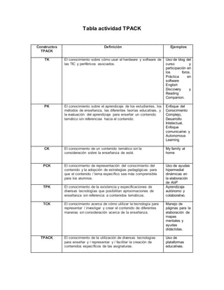 Este documento presenta una tabla que define los constructos del marco TPACK (Conocimiento Tecnológico Pedagógico del Contenido). Define TK como el conocimiento sobre el uso de hardware, software y periféricos; PK como el conocimiento sobre métodos de enseñanza y aprendizaje; CK como el conocimiento sobre un contenido temático; PCK como el conocimiento sobre la representación y enseñanza de un contenido; TPK como el conocimiento sobre el uso educativo de la tecnología; TCK como el uso de la tecnología para representar un