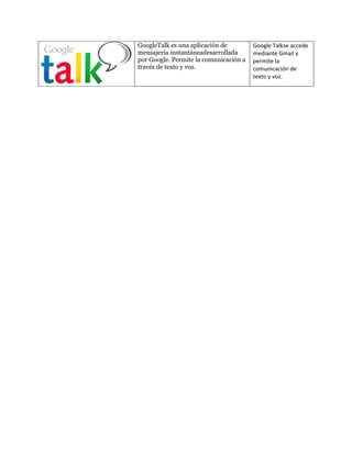 El documento presenta una tabla comparativa de tres servicios de mensajería: Skype, Messenger y Google Talk. Skype permite llamadas de voz y video si se tienen cámara y micrófono, mientras que Messenger y Google Talk son servicios de mensajería que se acceden a través de correos electrónicos y solo permiten chat de texto, a diferencia de Skype que requiere descargar una aplicación.