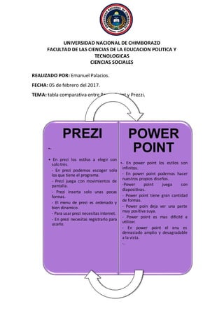 Este documento presenta una tabla comparativa entre PowerPoint y Prezzi, destacando las principales diferencias entre ambas herramientas de presentación. PowerPoint ofrece más estilos personalizables y formas, mientras que Prezzi se enfoca en movimientos de pantalla y solo requiere acceso a Internet.