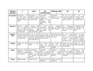El documento compara los requisitos mínimos de hardware para diferentes versiones de Windows, desde Windows 95 hasta Windows 7. Los requisitos incluyen procesador, memoria RAM, espacio en disco duro, unidades de disco y DVD, tarjeta de video y audio. Los requisitos aumentan a medida que las versiones de Windows son más recientes, desde 4 MB de RAM para Windows 95 hasta 1 GB de RAM y un procesador de 1 GHz para Windows 7.