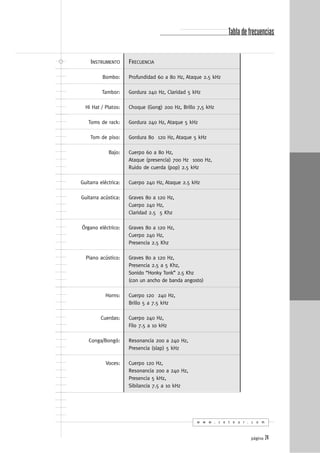 Este documento proporciona tablas de frecuencias típicas y parámetros de compresión habituales para varios instrumentos musicales. La tabla de frecuencias detalla las frecuencias clave de instrumentos como el bombo, el tambor, el hi-hat y más. La tabla de parámetros de compresión recomienda configuraciones típicas como la relación de compresión, el tiempo de ataque y el tiempo de relevo para instrumentos como el bombo, el tambor, las voces y otros.