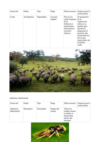 El documento describe dos tipos de fauna útil para controlar plagas: cerdos que se alimentan de bellotas caídas infectadas con larvas de curculio elephas, y el parasitoide Aphelinus abdominalis que controla pulgones del tomate al desarrollarse dentro de ellos. Además, proporciona detalles sobre el orden, tipo y empresa que comercializa a Aphelinus abdominalis.