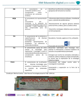 El documento describe un proyecto educativo sobre inventos para estudiantes de octavo grado. Incluye definiciones de los constructos TPACK y ejemplos de cómo aplicar cada uno en el proyecto. Los estudiantes investigarán y analizarán inventos usando películas y videos. Aplicarán un enfoque constructivista para desarrollar un pensamiento crítico. Presentarán sus hallazgos usando herramientas TIC como procesadores de texto y presentaciones.