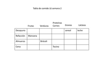 La tabla muestra la comida planificada para una semana, incluyendo frutas, verduras, carnes, granos y lácteos para el desayuno, refrigerio, almuerzo y cena. El desayuno incluye cereal y leche, el refrigerio una manzana, el almuerzo brócoli, y la cena tocino.