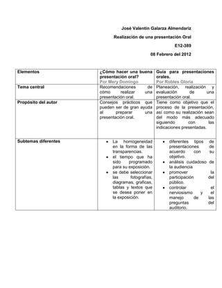 Este documento resume las guías "¿Cómo hacer una buena presentación oral?" y "Guía para presentaciones orales", las cuales ofrecen consejos sobre cómo planear, realizar y evaluar una presentación oral de manera efectiva, incluyendo temas como la preparación, la estructura, el manejo de nervios y la interacción con la audiencia.
