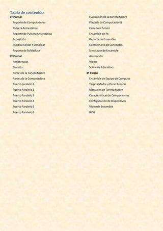 Este documento presenta los temas y actividades realizadas en la clase de Ensamblar y Configurar Equipo de Computadora. Incluye 1) Ensamblar un equipo de cómputo siguiendo especificaciones, 2) Explicar los componentes de una tarjeta madre, y 3) Instalar Linux en una memoria USB y explorar cómo instalar el sistema operativo. El documento proporciona instrucciones detalladas para varias prácticas y proyectos relacionados con hardware y software de computadoras.