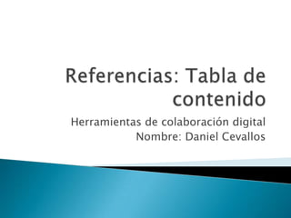 Este documento explica cómo crear, actualizar y personalizar una tabla de contenidos en Microsoft Word. Describe los pasos para establecer títulos jerárquicos, seleccionar una plantilla de tabla de contenidos, actualizarla si se agrega nuevo contenido, y modificar el formato y apariencia de la tabla de contenidos.