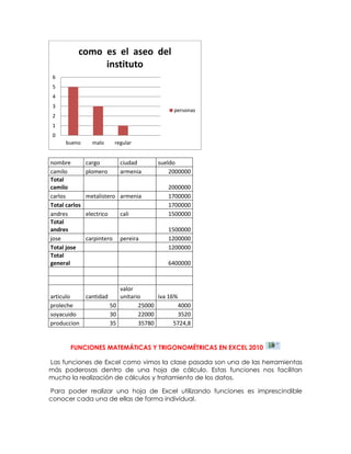 El documento presenta una tabla de contenido sobre conjuntos numéricos. Incluye secciones sobre números naturales, enteros, racionales, decimales, irracionales y reales. También describe algunas funciones matemáticas y trigonométricas útiles en Excel como ENTERO, TRUNCAR, REDONDEA.PAR, SIGNO y NUMERO.ROMANO.