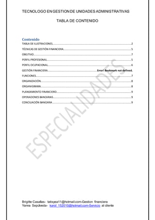 Este documento presenta la descripción de un perfil profesional de técnico en gestión financiera. Explica que este perfil involucra habilidades como el análisis financiero, la elaboración de presupuestos, la gestión de operaciones bancarias y la conciliación bancaria. También describe las funciones clave de este rol profesional como la determinación de necesidades financieras, la consecución de financiamiento, y el análisis de la viabilidad de inversiones.