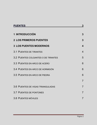 El documento describe los diferentes tipos de puentes a través de la historia y en la actualidad. Explica que los primeros puentes probablemente consistían en troncos o cuerdas para cruzar arroyos o valles estrechos. Los romanos construyeron muchos puentes de piedra con arcos. Los puentes modernos incluyen puentes de tirantes, colgantes, de arco de acero, de arco de hormigón, de vigas trianguladas y de pontones. El documento proporciona ejemplos notables de cada tipo de puente modern