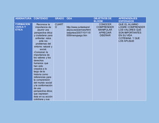 Este documento presenta una tabla de contenidos para varias asignaturas escolares. Proporciona los objetivos de aprendizaje esperados para cada asignatura y enlaces a juegos educativos en línea para reforzar esos objetivos. Los juegos cubren temas como valores cívicos, geografía, español, historia, ciencias y más, y tienen el propósito de ayudar a los estudiantes a comprender y aplicar conceptos clave de manera entretenida.