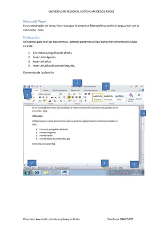 El documento proporciona instrucciones sobre cómo utilizar Microsoft Word y Gmail. Explica cómo insertar tablas, imágenes, encabezados, pies de página y tablas de contenido en Word. También describe cómo capturar pantallas y los elementos básicos de la interfaz de usuario de Word y Gmail.