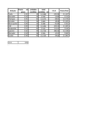 El documento presenta las ventas de 10 artículos, mostrando el precio de cada uno, la cantidad vendida, el total recaudado, el IVA aplicado al 22% y el precio final con IVA. Los artículos con mayores ventas fueron el shampoo con $2,776, el lapicero con $2,108 y la escoba con $1,867.