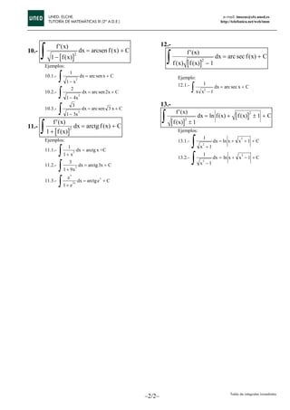 (1) La tabla presenta fórmulas para integrales inmediatas, incluyendo integrales de funciones racionales, trigonométricas y exponenciales. (2) Se proporcionan ejemplos para ilustrar cada fórmula. (3) El documento ofrece una guía rápida para calcular integrales comunes.