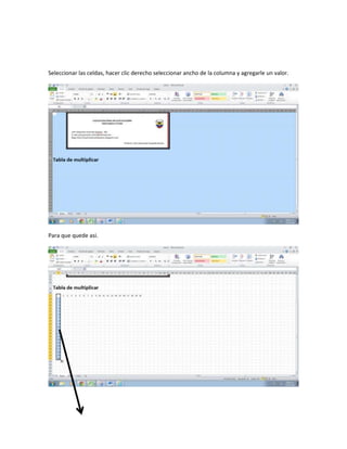 El documento describe los pasos para crear una tabla con números y fórmulas en una hoja de cálculo. Incluye instrucciones para seleccionar celdas, ajustar el ancho de columnas, crear una serie numérica, agregar bordes a la tabla, crear una fórmula de multiplicación y copiarla para llenar celdas adicionales.