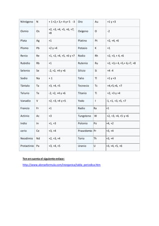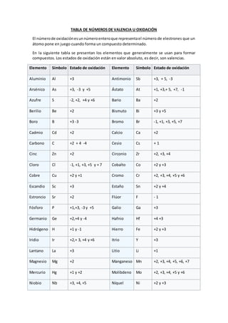 La tabla presenta los estados de oxidación más comunes de varios elementos, los cuales representan el número de electrones que el átomo cede o gana al formar compuestos. Algunos elementos como el aluminio, antimonio y azufre pueden tener estados de oxidación de +3, +3, +5, -3 y -2, +2, +4 respectivamente. La tabla también incluye enlaces a información adicional sobre los estados de oxidación de los elementos.