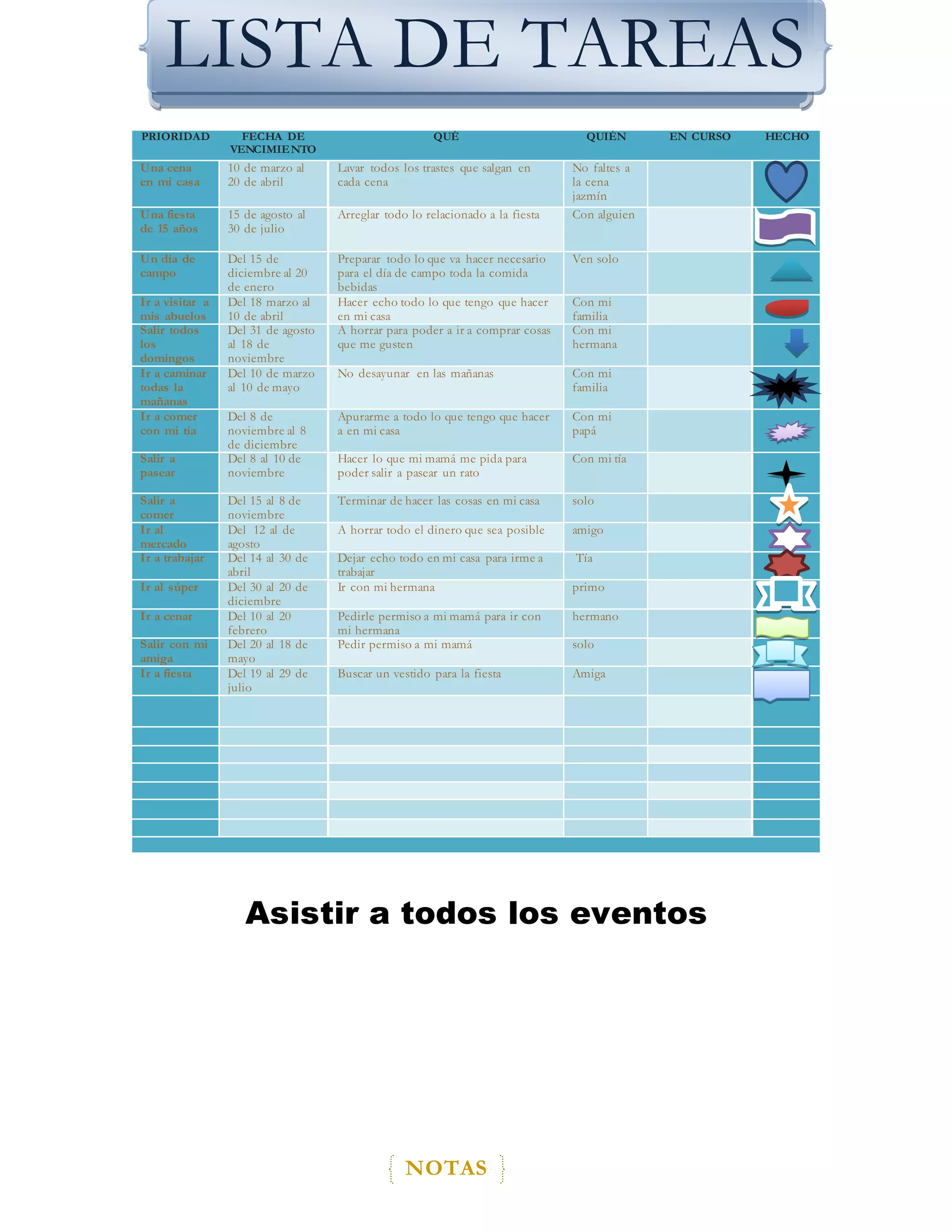 El documento presenta una lista de tareas pendientes con fechas de vencimiento, incluyendo preparativos para eventos como una cena, una fiesta de 15 años, un día de campo y visitas a familiares, así como salidas diarias para caminar, comer, ir de compras y más. Cada tarea incluye detalles sobre qué hacer, con quién y notas adicionales.