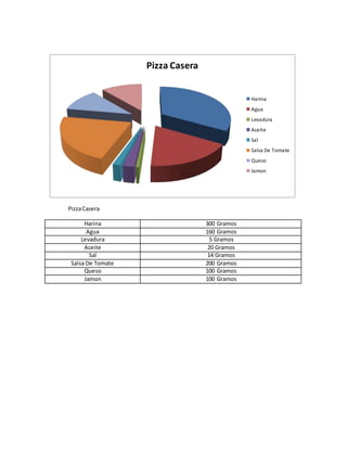 Este documento contiene varias tablas con recetas de comida. En la primera tabla se proporcionan los ingredientes y cantidades para hacer una pizza casera, incluyendo harina, agua, levadura, aceite, sal, salsa de tomate, queso y jamón. Otra tabla muestra los ingredientes para hacer un pastel casero con azúcar, harina, margarina, esencia, leche en polvo y huevos. Una tercera tabla detalla los ingredientes para cocinar un pavo, como pavo, pimienta, orégano, az