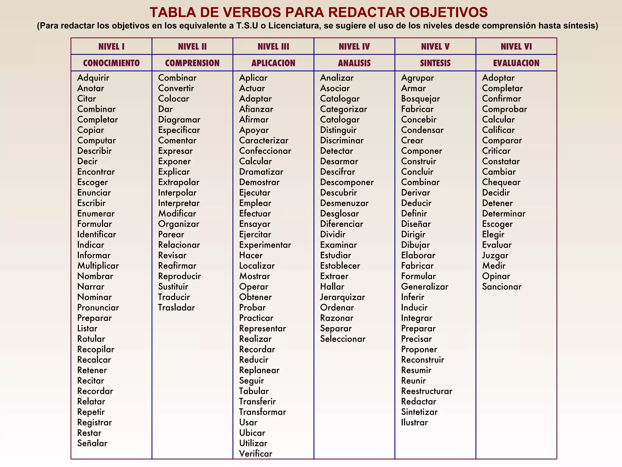 Este documento presenta una tabla de verbos ordenados por nivel para redactar objetivos educativos, desde el nivel de comprensión hasta el de síntesis. En los niveles iniciales se incluyen verbos como describir, enumerar e identificar, mientras que en los niveles más avanzados figuran verbos como analizar, aplicar y sintetizar. La tabla busca servir de guía para redactar objetivos acordes al nivel educativo, ya sea de técnico superior universitario o de licenciatura.