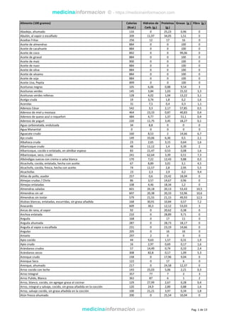 Este documento proporciona información nutricional sobre una amplia variedad de alimentos, incluyendo calorías, hidratos de carbono, proteínas, grasas y fibra por cada 100 gramos. La tabla incluye entradas para carnes, pescados, frutas, verduras, nueces, aceites, bebidas y postres. Proporciona datos detallados sobre el contenido nutricional de más de 100 alimentos comunes.