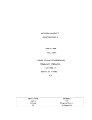 El documento presenta información sobre una base de datos que incluye el nombre de dos estudiantes, el nombre de su institución educativa, el grado y la fecha. Además, detalla las asignaturas y docentes del plantel, las dependencias de la institución y normas APA.