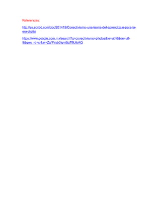 El documento define el conectivismo como una teoría de aprendizaje para la era digital propuesta por Siemens que se enfoca en las redes y conexiones que están cambiando la forma de aprender de forma irreversible. El conectivismo se caracteriza por la interacción física y digital asíncrona y sincrónica entre personas y objetos. Implica que los estudiantes aprenden al conectarse a recursos y participar activamente en redes utilizando tecnología social. El rol del docente es crear un espacio democrático de aprendizaje con
