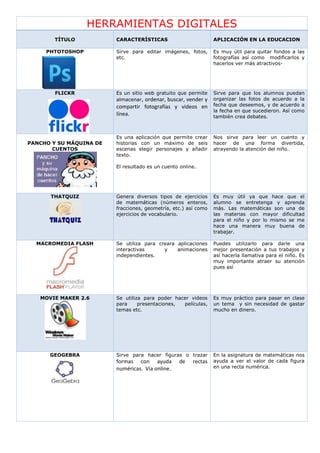 Este documento presenta una tabla con 18 herramientas digitales, incluyendo Photoshop, Flickr, Pancho y su máquina de cuentos, Thatquiz, Movie Maker, Geogebra, Bubbl.us, Mediafire, Cmaptool, Audacity, Mind42, Slideshare, Youtube, Atube catcher, Excel, Pencil, VLC y Picasa. Describe brevemente las características y aplicaciones educativas de cada herramienta.