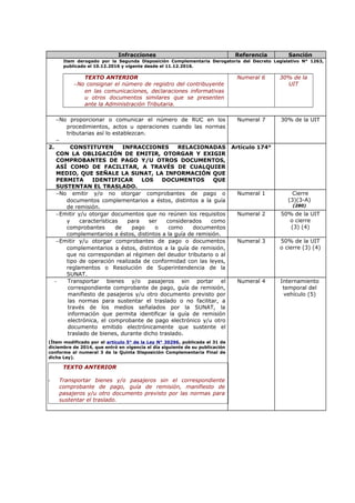 Este documento presenta la Tabla I del Código Tributario que enumera las infracciones y sanciones aplicables a personas y entidades generadoras de renta de tercera categoría. La tabla describe 14 infracciones relacionadas con la obligación de registrarse, emitir comprobantes de pago u otros documentos, y transportar o remitir bienes. Para cada infracción se especifica la sanción correspondiente, que puede incluir multas o el comiso de bienes o vehículos.