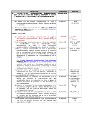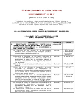 Este documento presenta la Tabla I del Código Tributario del Perú, la cual enumera las infracciones y sanciones aplicables a personas y entidades generadoras de renta de tercera categoría. Describe 16 infracciones relacionadas con la obligación de emitir, otorgar y exigir comprobantes de pago, así como 7 infracciones relacionadas con la obligación de llevar libros y registros. También detalla 8 infracciones relacionadas con la obligación de presentar declaraciones y comunicaciones, así como 5 infracciones relacionadas con la obligación de permitir el control