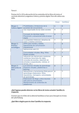 La tarea consiste en puntuar de 0 a 10 la adecuación de contenidos de libros de texto al currículo de cultura y práctica digital, destacando diferentes bloques temáticos. El libro de la editorial Anaya es considerado más completo y práctico en comparación con el de Santillana, el cual muestra lagunas en áreas como el ciberacoso. Se justifica la elección de Anaya basándose en las puntuaciones asignadas a los contenidos.