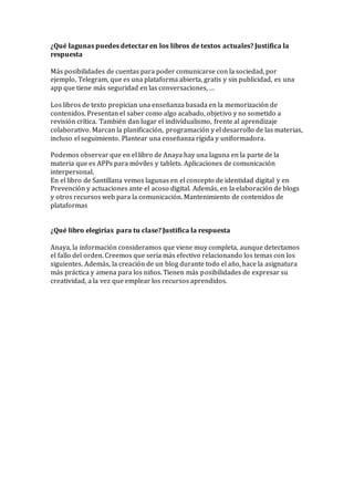 Este documento presenta una tabla para puntuar de 0 a 10 la adecuación de los contenidos de dos libros de texto al currículo oficial de la asignatura Cultura y práctica digital. Se evalúan tres bloques temáticos de cada libro publicado por Anaya y Santillana. El documento también incluye preguntas sobre posibles lagunas detectadas en los libros de texto y sobre cuál libro elegiría para su clase, justificando la respuesta.
