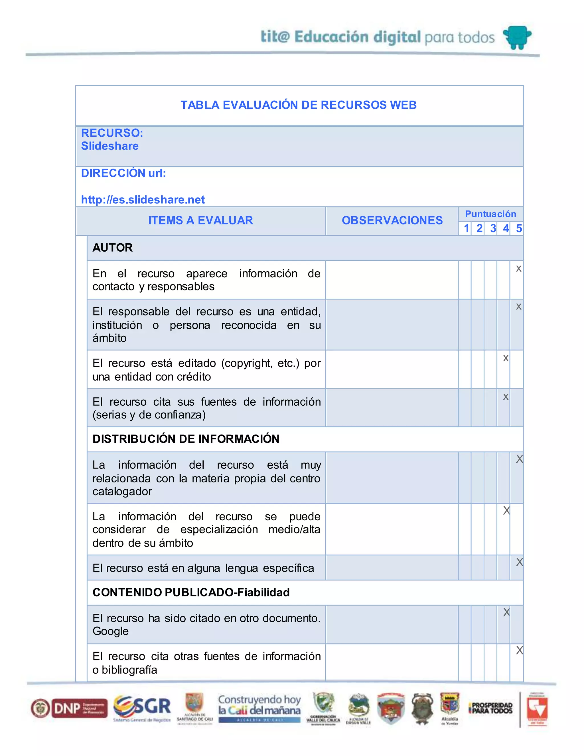 Slideshare es un sitio web que permite compartir presentaciones y documentos en formato digital. Proporciona información de contacto y está editado por una entidad reconocida. El contenido publicado es confiable y cita fuentes serias. El acceso no requiere software especial y el recurso está disponible de forma habitual, mostrando fechas de creación y revisión.