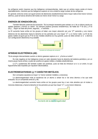 El documento describe las propiedades periódicas de los elementos, incluida la carga nuclear efectiva (Z*), el tamaño atómico, la energía de ionización, la afinidad electrónica y la electronegatividad. Z* depende de la carga nuclear real (Z) y del apantallamiento electrónico, variando poco al aumentar Z dentro de un grupo debido a un mayor apantallamiento. El tamaño atómico disminuye a lo largo de un período y aumenta a lo largo de un grupo, mientras que la energía de