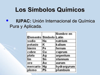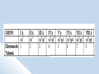 El documento describe la tabla periódica de los elementos químicos. Explica que la IUPAC organiza la tabla, la cual contiene 7 períodos con diferentes números de elementos en cada uno. También describe las características de algunos grupos específicos como los metales alcalinos, los metales alcalinotérreos, los halógenos y los gases nobles. Finalmente, explica que la configuración electrónica de los elementos indica su grupo y período en la tabla, así como sus propiedades químicas.