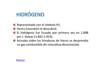 El documento presenta breves descripciones de varios elementos químicos, incluyendo la fecha y lugar de su descubrimiento y quién los descubrió. Se proporciona información sobre el hidrógeno, calcio, cromo, níquel, platino, dubnio, talio, rutenio, cobalto e iterbio.