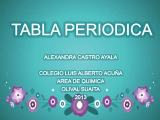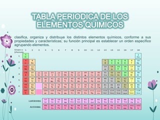 El documento describe la evolución histórica de la tabla periódica de los elementos desde sus orígenes hasta su forma moderna, incluyendo las primeras clasificaciones propuestas por científicos como Lavoisier, Newlands y Mendeléyev, y cómo se fue descubriendo y agregando nuevos elementos a lo largo de los siglos.