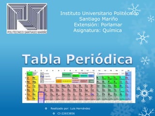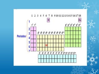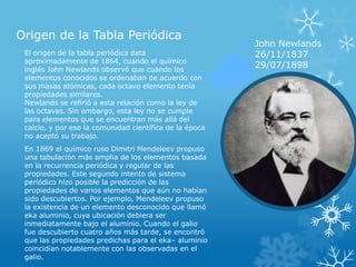 Este documento describe el origen y desarrollo de la tabla periódica. John Newlands observó en 1864 que los elementos compartían propiedades cada 8 elementos y propuso la ley de las octavas, pero no fue aceptada. En 1869, Mendeleev propuso una clasificación más amplia basada en propiedades periódicas que permitió predecir propiedades de elementos aún no descubiertos. La tabla periódica actual clasifica los elementos y predice sus propiedades basada en su configuración electrónica.