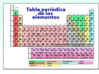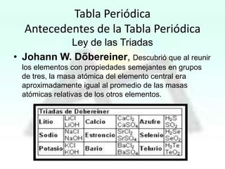 El documento presenta información sobre la tabla periódica, incluyendo sus antecedentes históricos,
