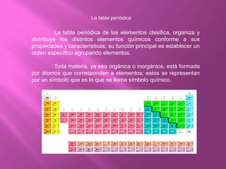 El documento habla sobre la tabla periódica de los elementos. Explica que la tabla clasifica y organiza los elementos químicos de acuerdo a sus propiedades, agrupándolos en un orden específico. También describe brevemente la historia de la tabla periódica, incluyendo el descubrimiento de los elementos a través de los siglos y el desarrollo del concepto de masa atómica y número atómico. Finalmente, resume la estructura y organización actual de la tabla periódica, con sus periodos y grupos.