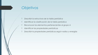 La tabla periódica describe la estructura y propiedades periódicas de los elementos. La tabla contiene siete períodos y 18 grupos. Las propiedades periódicas, como el radio atómico y la energía de ionización, varían sistemáticamente a lo largo de la tabla debido a cambios en la carga nuclear efectiva y la configuración electrónica de los elementos.